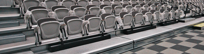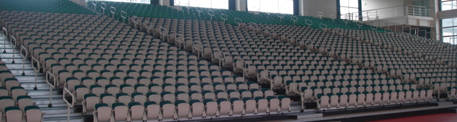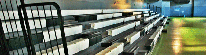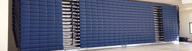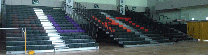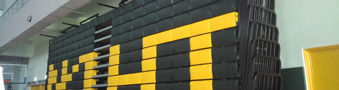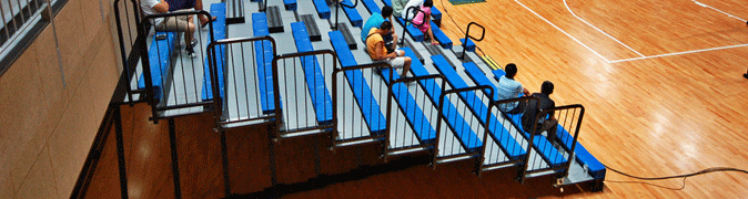 看台採高張力鋼材,結構設計採傾斜式架構,穩定堅固,橫樑有較好應力避免沉陷 互鎖包覆式上部, 與底部導軌設計,以確保看台結構伸展,收合能直線運行。 所有配件,踏階、鋼構、邊緣皆為圓弧設計; 無尖銳邊緣。 大尺寸橡膠滾輪5”以上,以平均分散看台靜態與動態負載,減少樓板負載與保護地板。