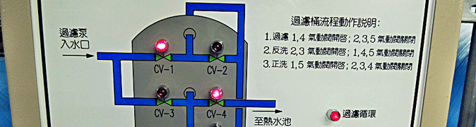 此控制器主要係控制過濾桶(氣動閥或電動閥)之開啟狀 況,以利控制循環水流之方向,利用五口二位閥(氣動閥) 或繼電器開關(電動閥),主要監視過濾循環之循環水壓 力差來判別過濾桶之清潔度。 可連接水流計及壓差計來控制過濾桶之過濾循環操作, 並搭載全監控自動逆洗裝置來維護客戶之使用池水之 清潔度,也可搭配水質感測器來達成一連串之系統控制